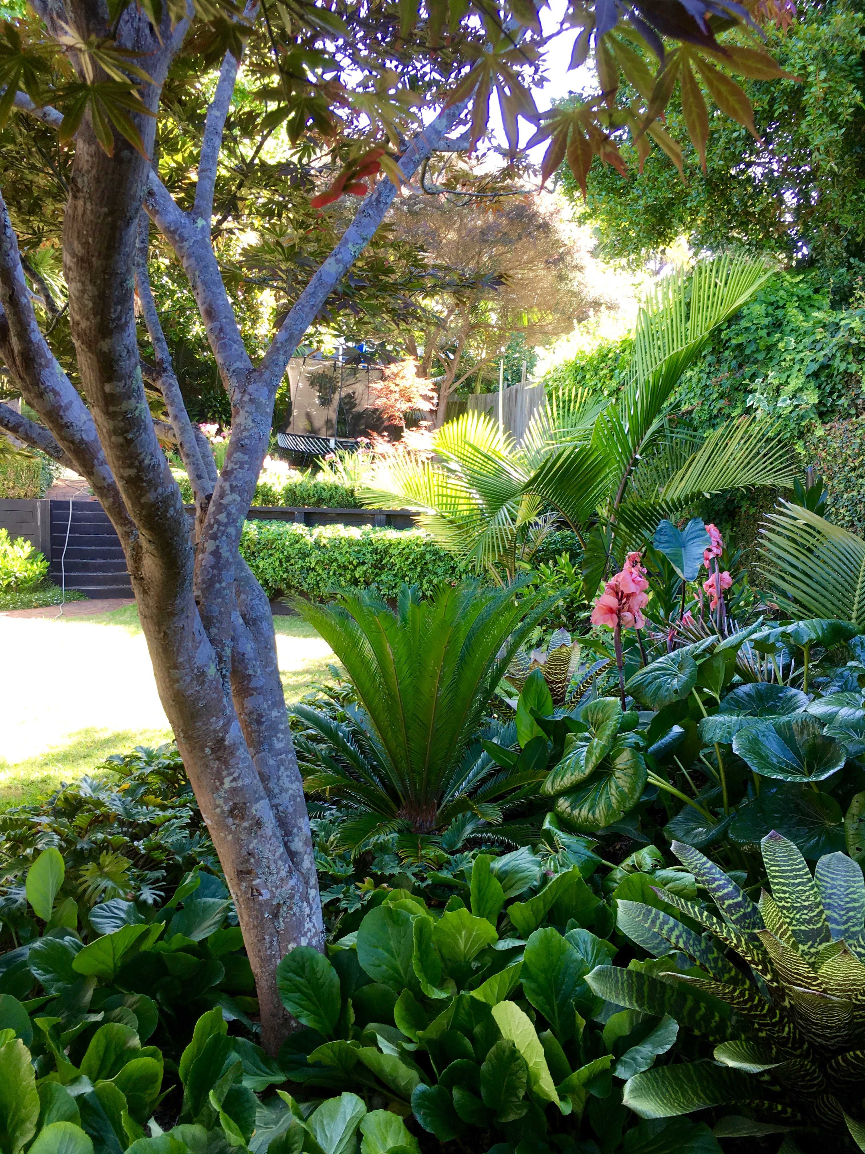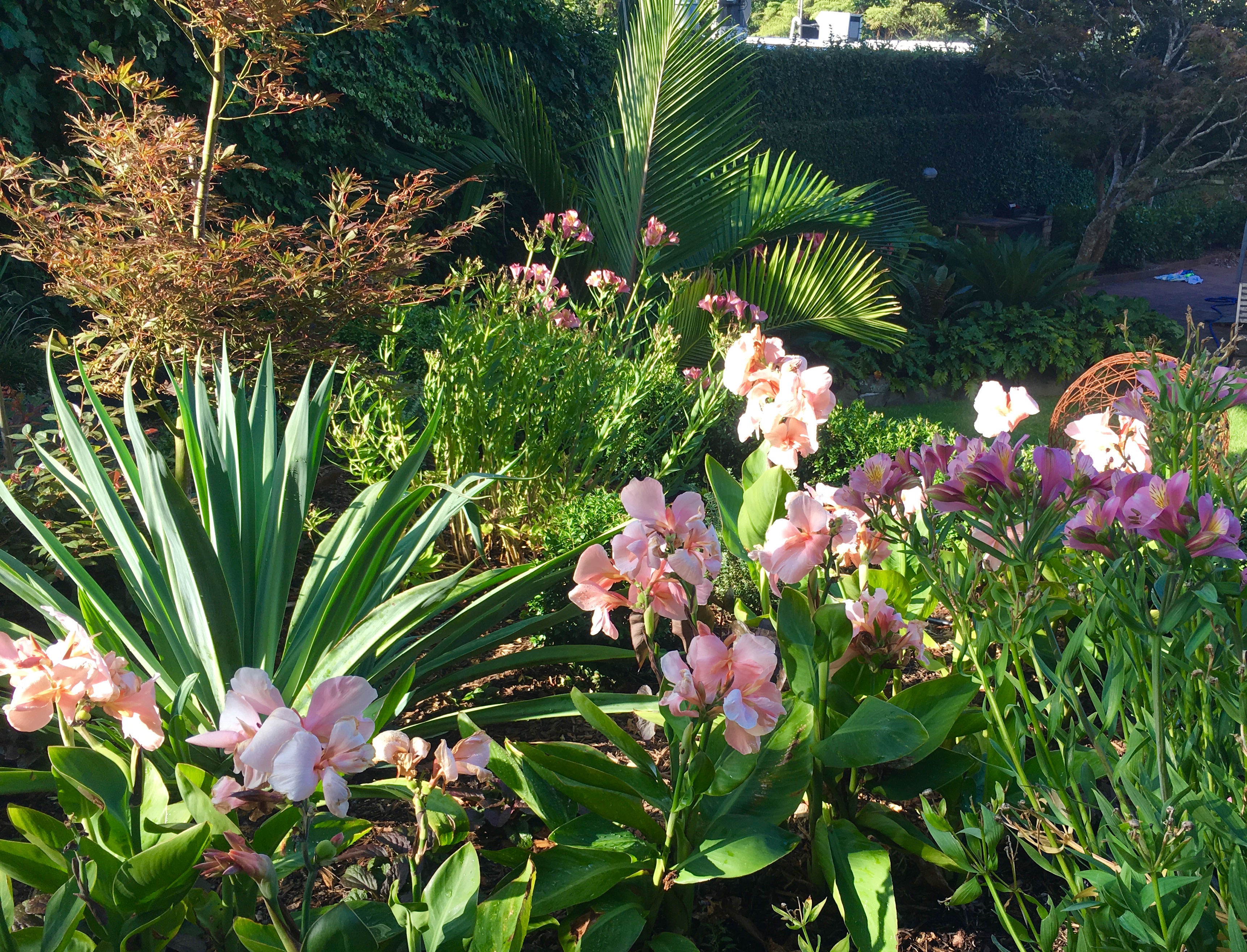 This client was eager to add more colour to a shady foliage garden. A central garden bed was created to take advantage of the sunniest aspect. Maples, alstromerias and buxus topiary create whimsy whilst canna lilies add a bold splash of the softest pink.