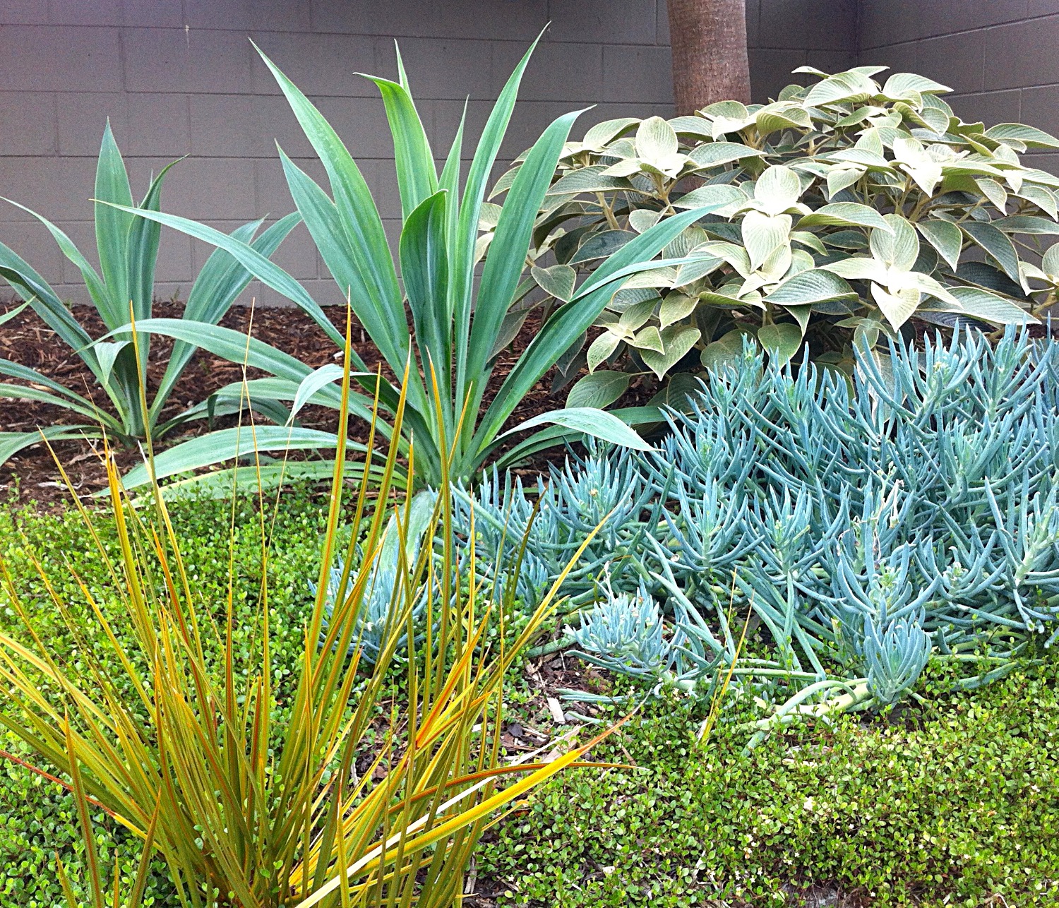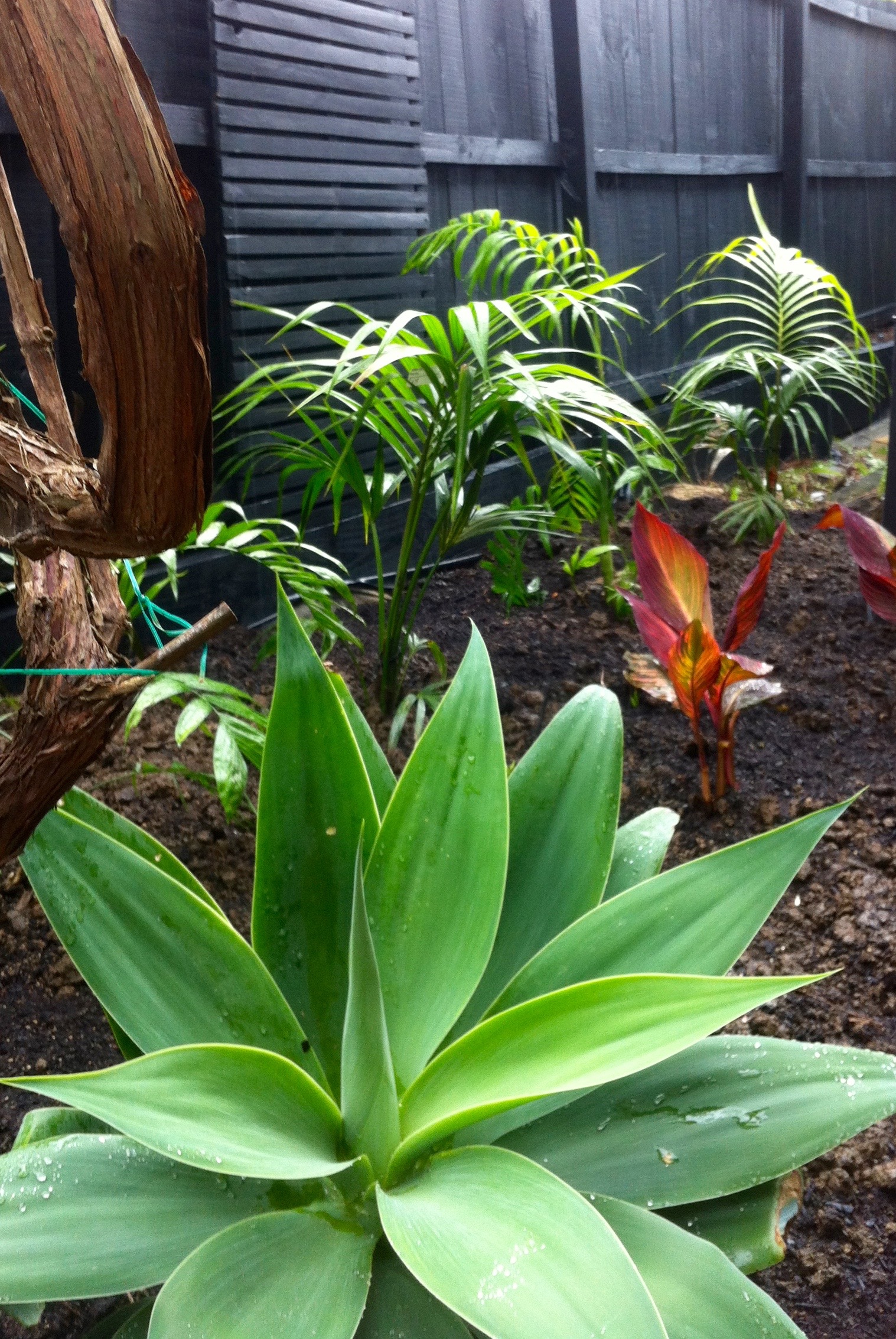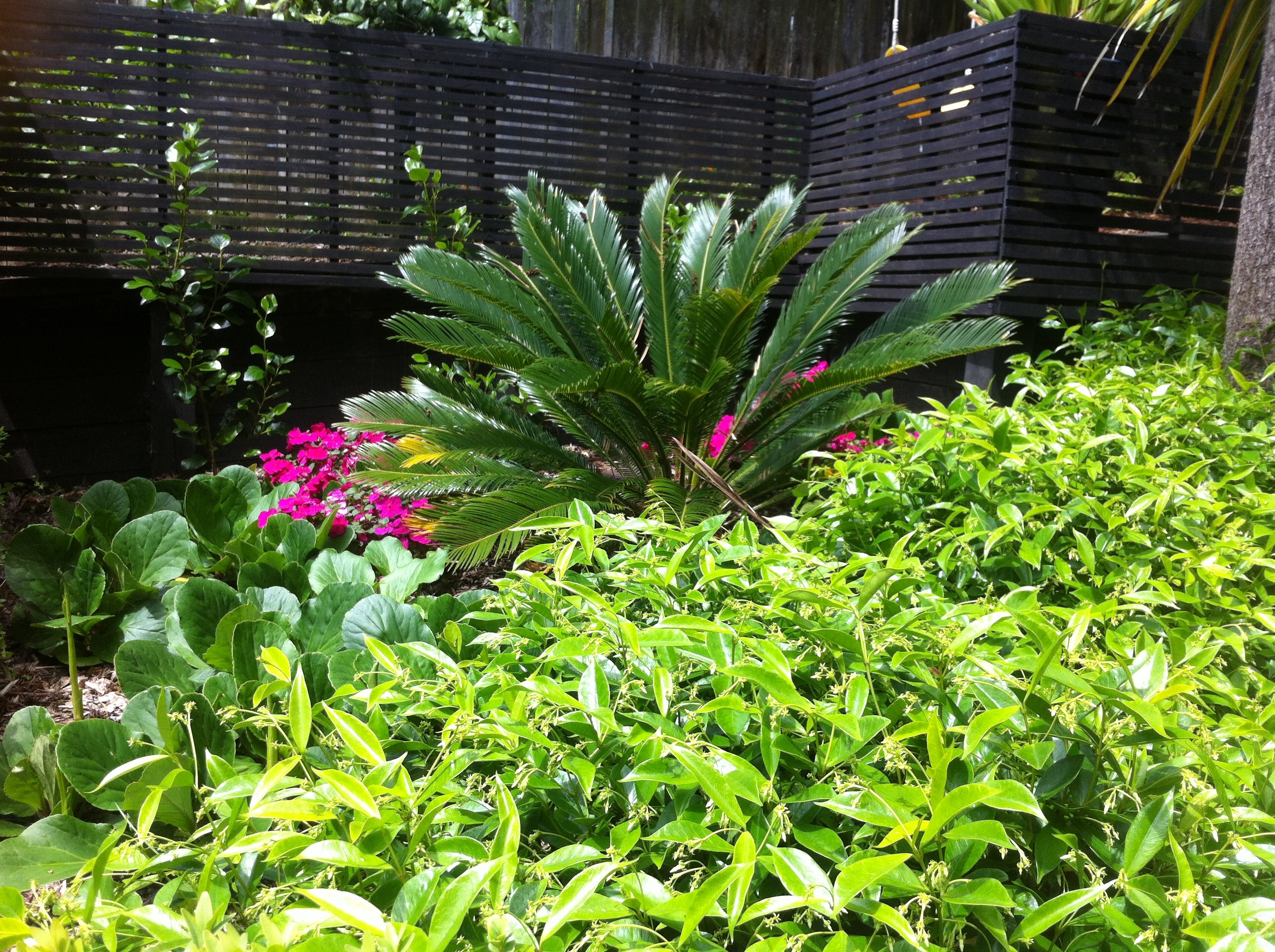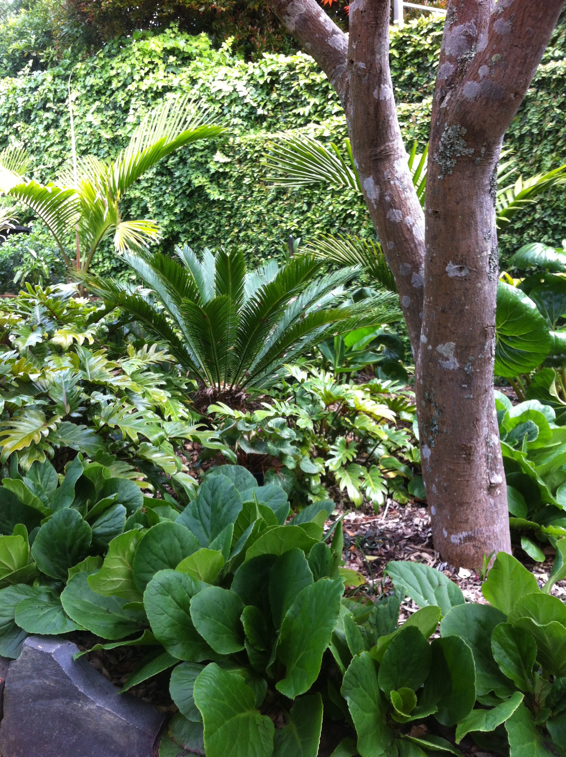 This garden was dominated by large trees and tall concrete block walls. Shade loving subtropicals added a rich focal point for the living area and integrated the trees into the garden beds.