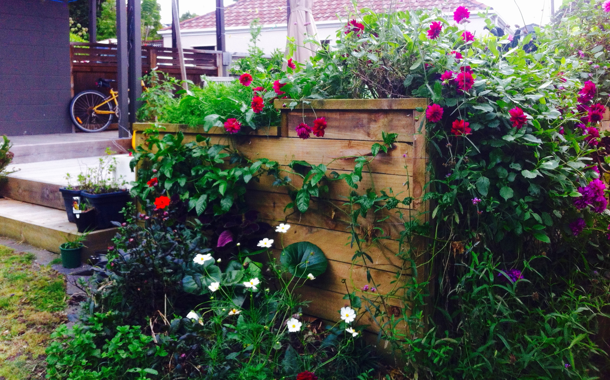 Tired of drinking her morning coffee on the back steps, this home owner wanted a level, sunny spot for casual entertaining. The result is an intimate space with built-in seating and deep planter boxes that wrap around the deck. The boxes are planted with an exuberant mix of flowering perennials and vegetables.
