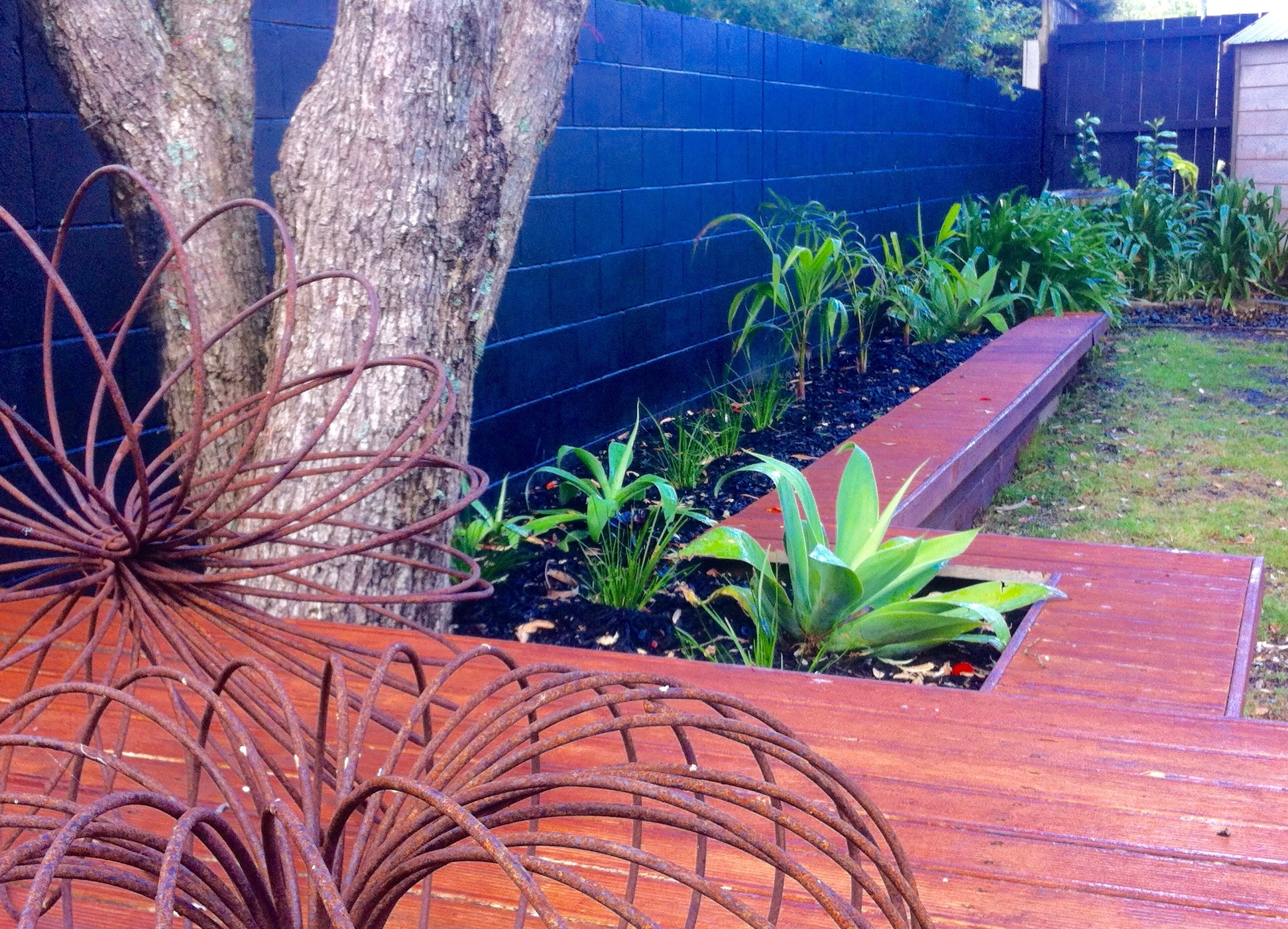 This was a difficult site with drainage issues and large mature trees. This is a garden of texture and colour that draws it's inspiration from the Pacific Rim.
